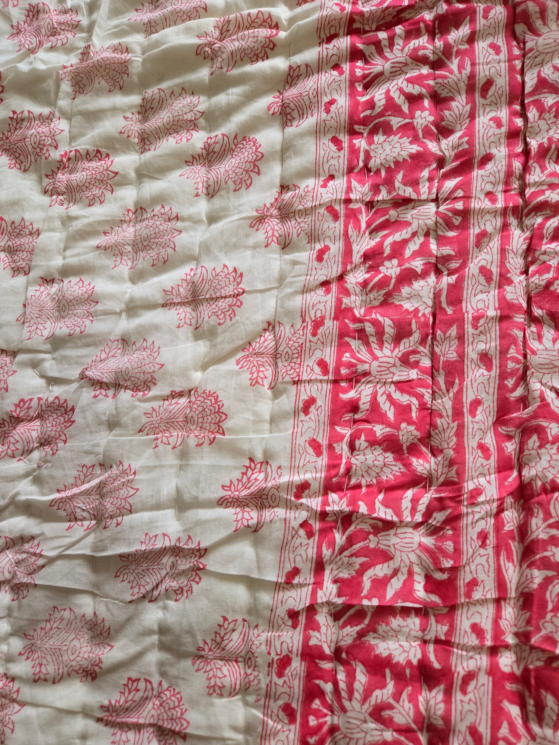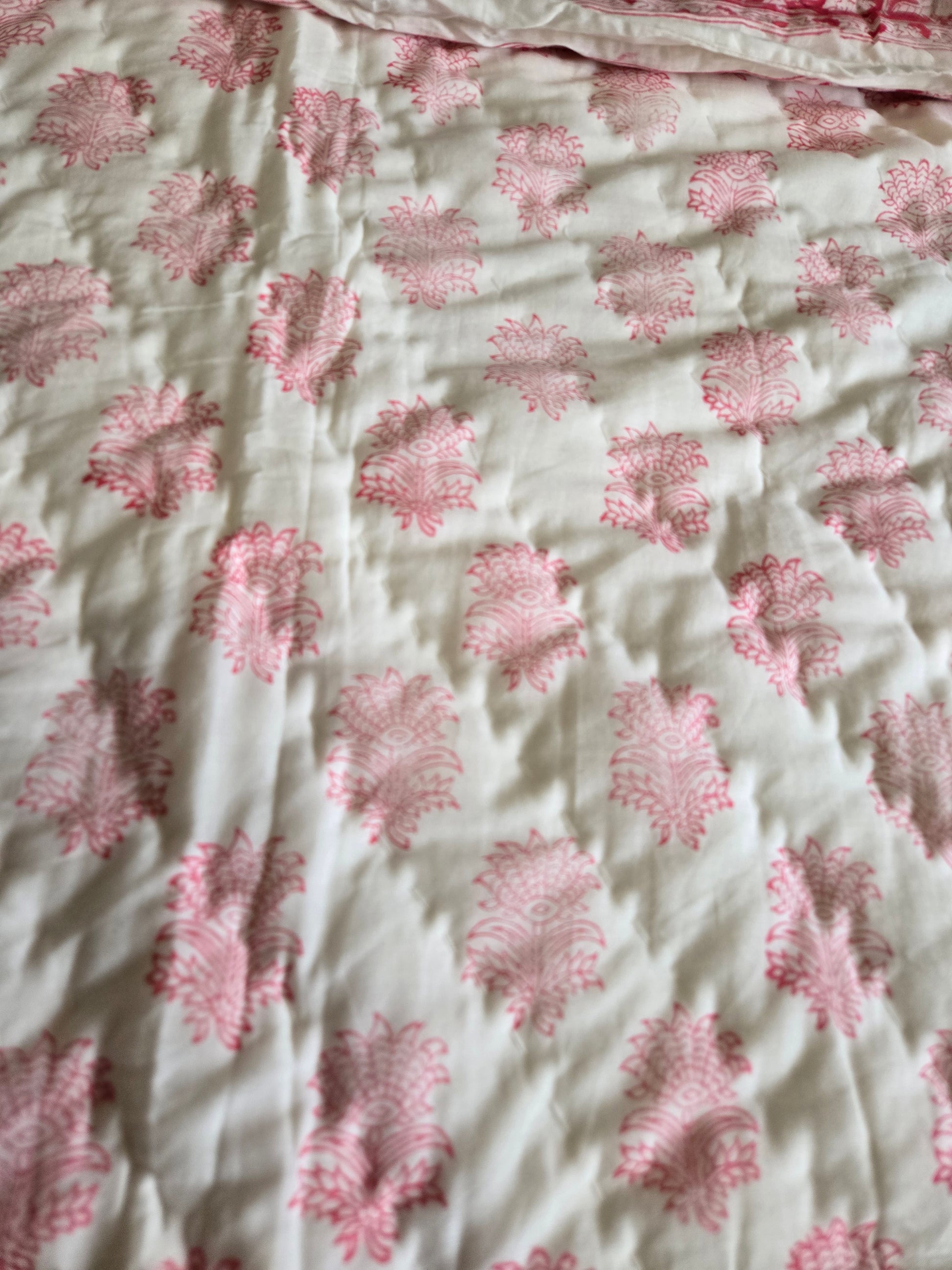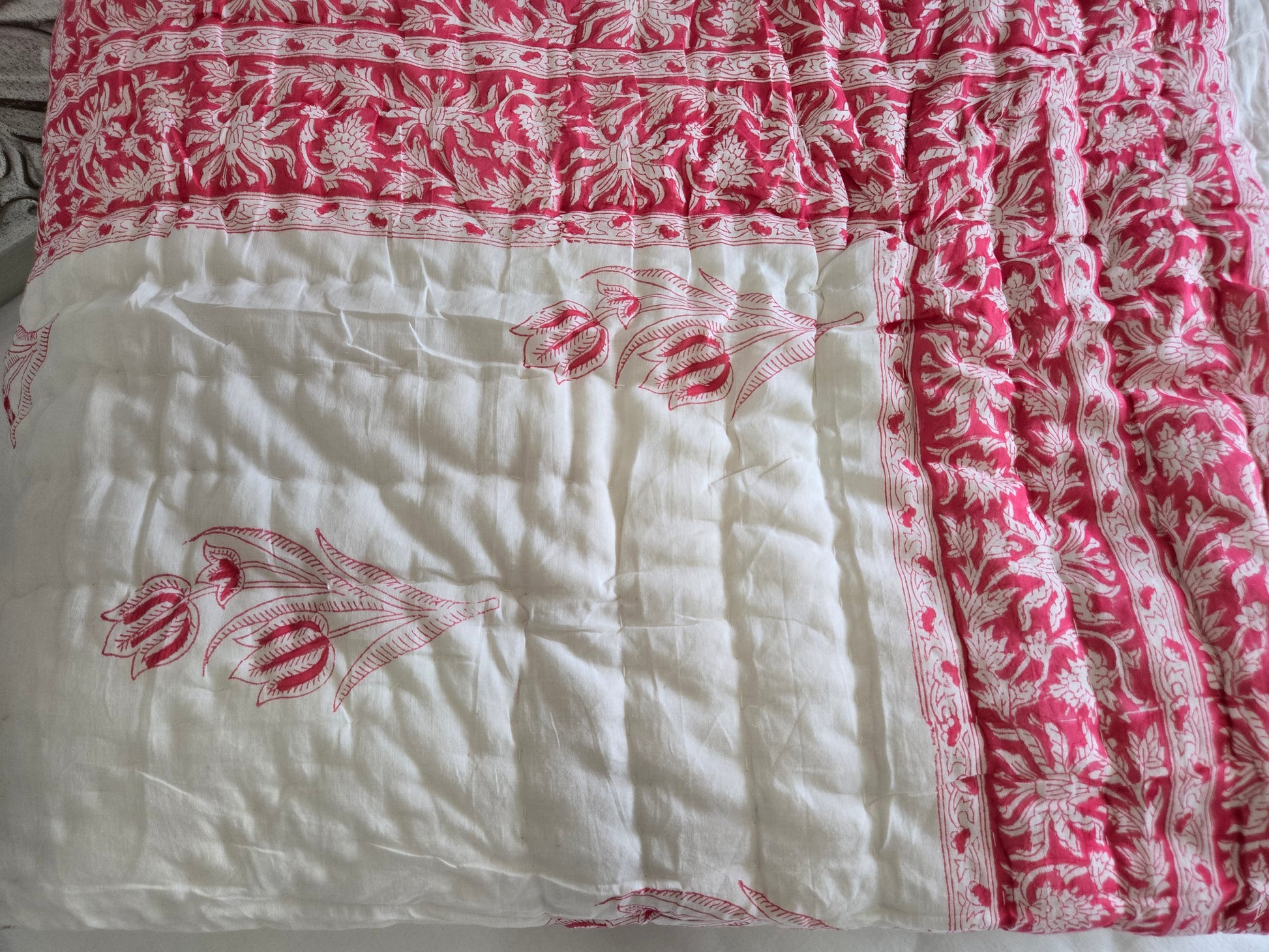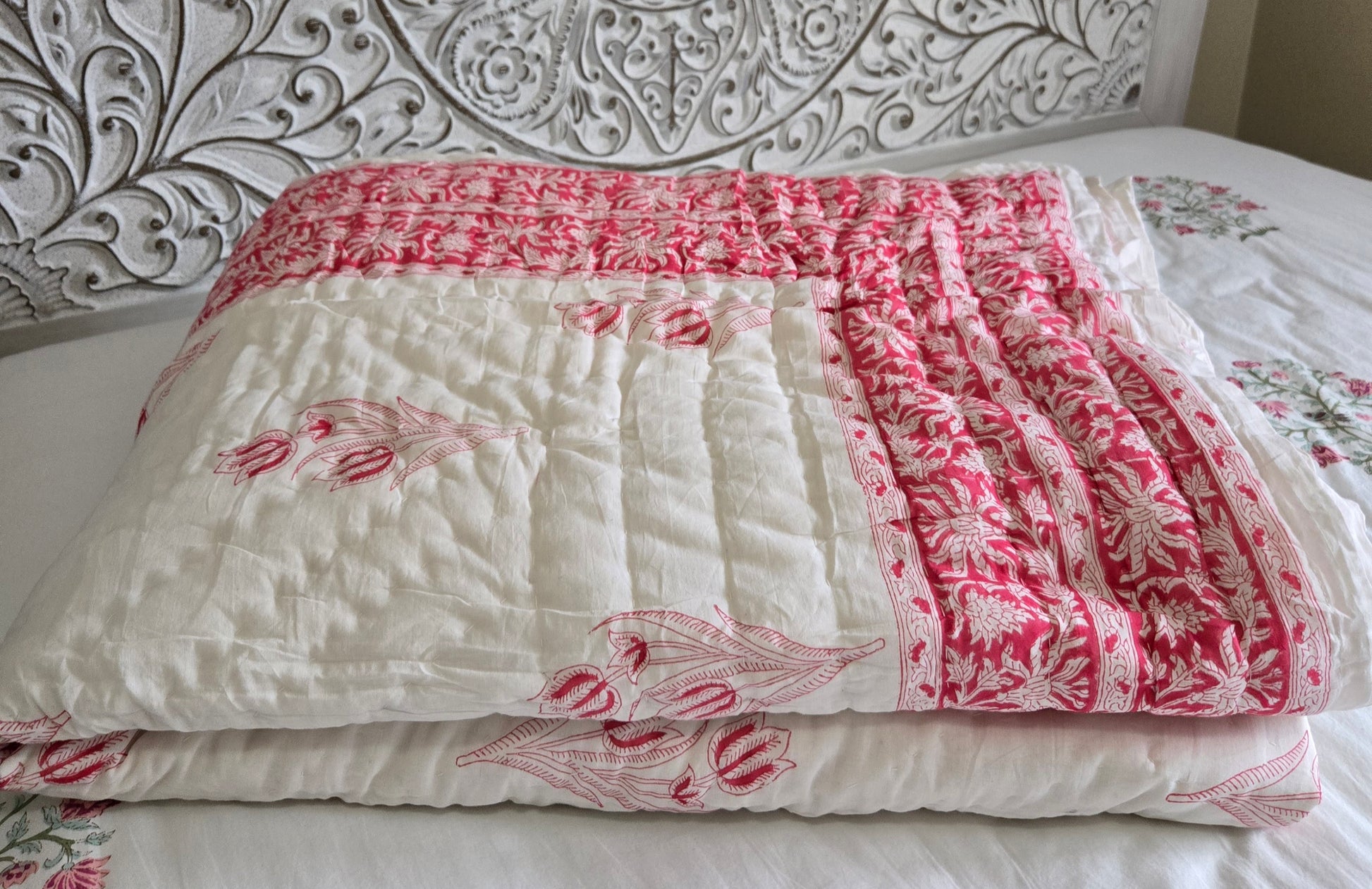 Soft, serene, and elegant — Blush Tulip Reversible Quilt is a graceful tribute to handcrafted beauty. This reversible hand-block printed quilt features delicate tulip motifs in dusty rose on a creamy ivory base. The reverse showcases intricate floral detailing in rich pink tones with a classic Mughal-style border — giving you two sophisticated looks in one.