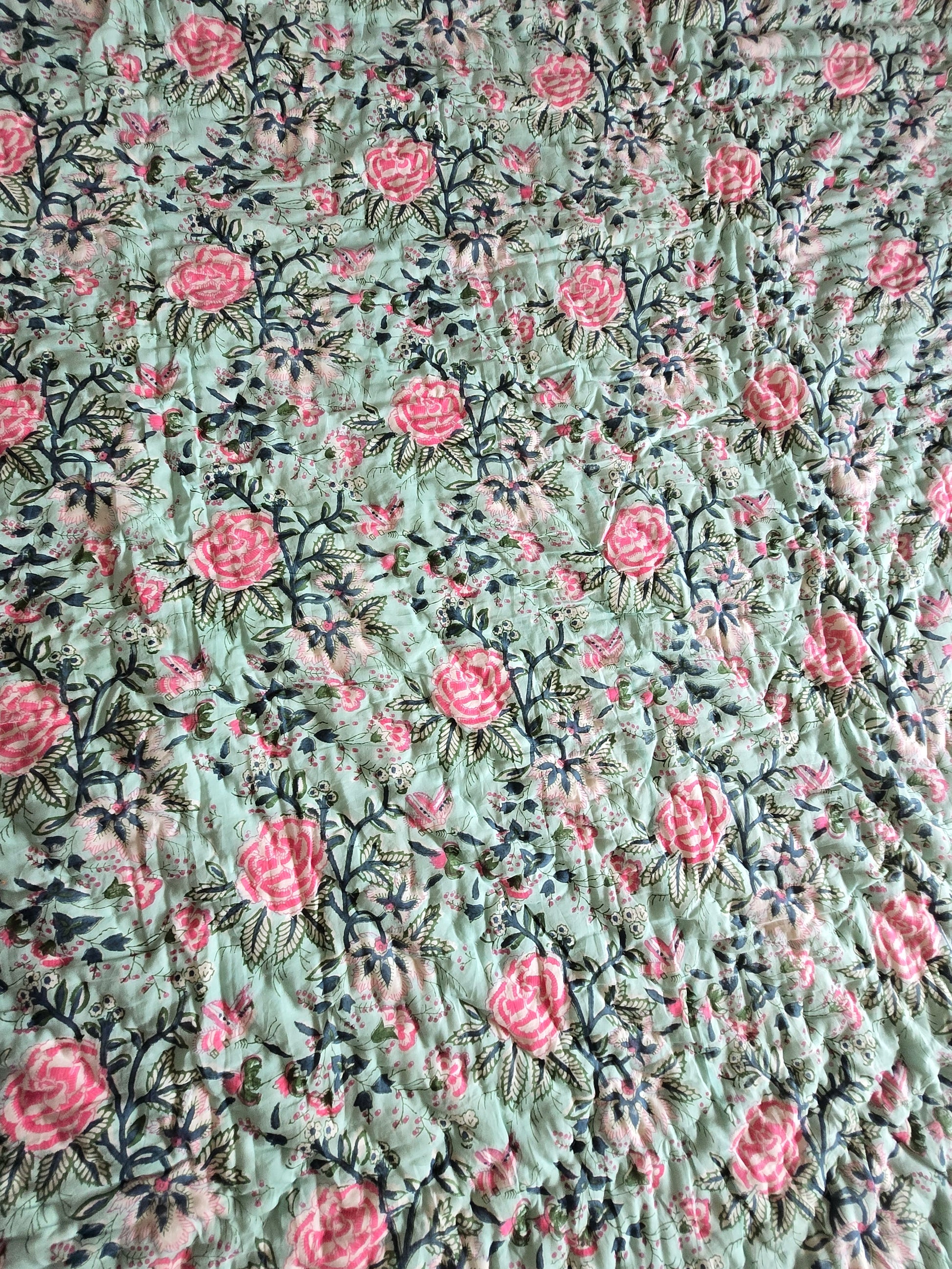 Wrap yourself in heritage with our Rosewood Bloom Quilt — a masterpiece of traditional hand-block printing, where every rose tells a story. Crafted from 100% pure cotton and filled for year-round comfort, this quilt blends functionality with art. The soft mint green base is adorned with hand-printed blush and coral roses, framed by intricate borders for a timeless, romantic appeal. Lightweight yet warm, it’s perfect for layering on a bed or cozying up with on a couch.