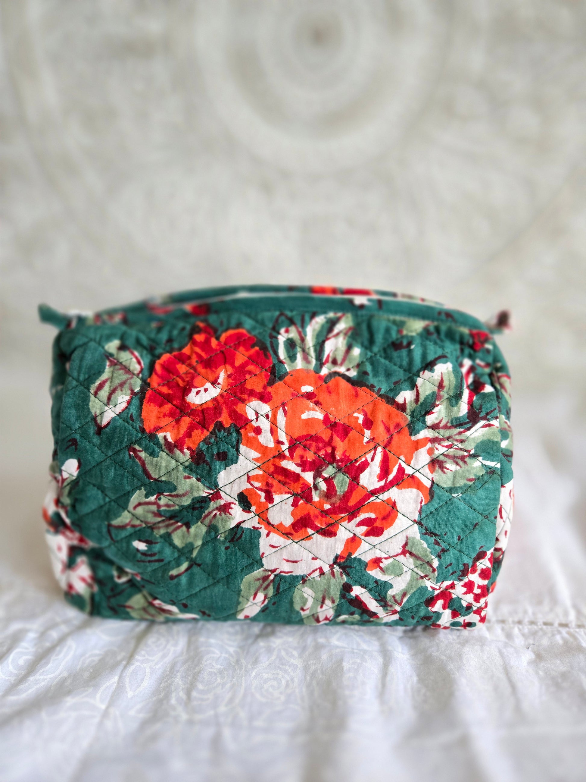Rich, romantic, and rooted in nature — the Scarlet Forest Quilted Pouch Set is where deep emerald meets fiery florals. Hand-block printed on diamond-quilted cotton, this set captures the bold spirit of blooming gardens with a luxurious, earthy twist.