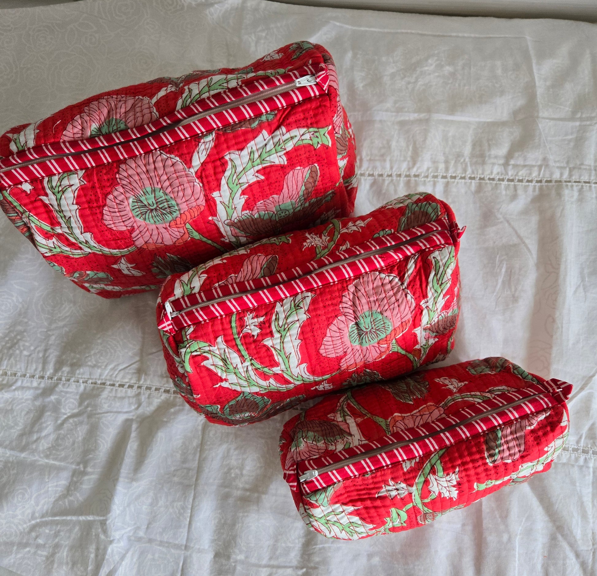 Handcrafted from soft quilted cotton, our Scarlet Poppy Blooms pouch set bursts with bold red and blush florals in an intricate handblock print. Lined for durability and stitched with care, these multipurpose pouches are perfect for cosmetics, travel, or gifting. Set includes three sizes to keep all your essentials beautifully organized.