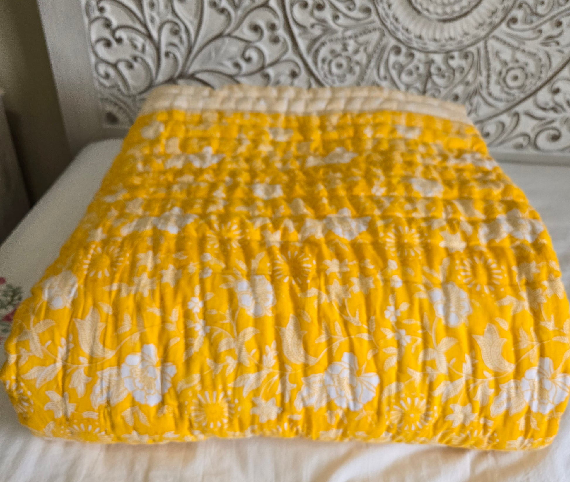 Brighten your space with the radiant charm of the Sunkissed Meadow Reversible Quilt. Hand-block printed by skilled artisans, this reversible cotton quilt features a delightful yellow and white floral design inspired by blooming fields in sunlight. The contrasting reverse side adds subtle elegance with intricate ochre floral motifs on a soft ivory base, offering two looks in one.